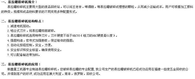 易拉罐破碎機(jī)是一種新型的,節(jié)能環(huán)保的用以破碎易拉罐等金屬及回收的金屬材料進(jìn)行粉碎,以實(shí)現(xiàn)資源的回收再利用的新型破碎設(shè)備;它還集合了******粉碎機(jī)的優(yōu)點(diǎn),是一種先進(jìn)的粉碎設(shè)備。
